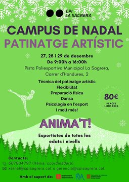 Campus de patinatge artístic. El 27, 28 i 29 de desembre de 9:00 a 16:00. Esportistes de totes les edats i nivells! Treballarem tècnica de patinatge artístic, flexibilitat, preparació física, dansa, psicologia en l'esport i molt més!!!